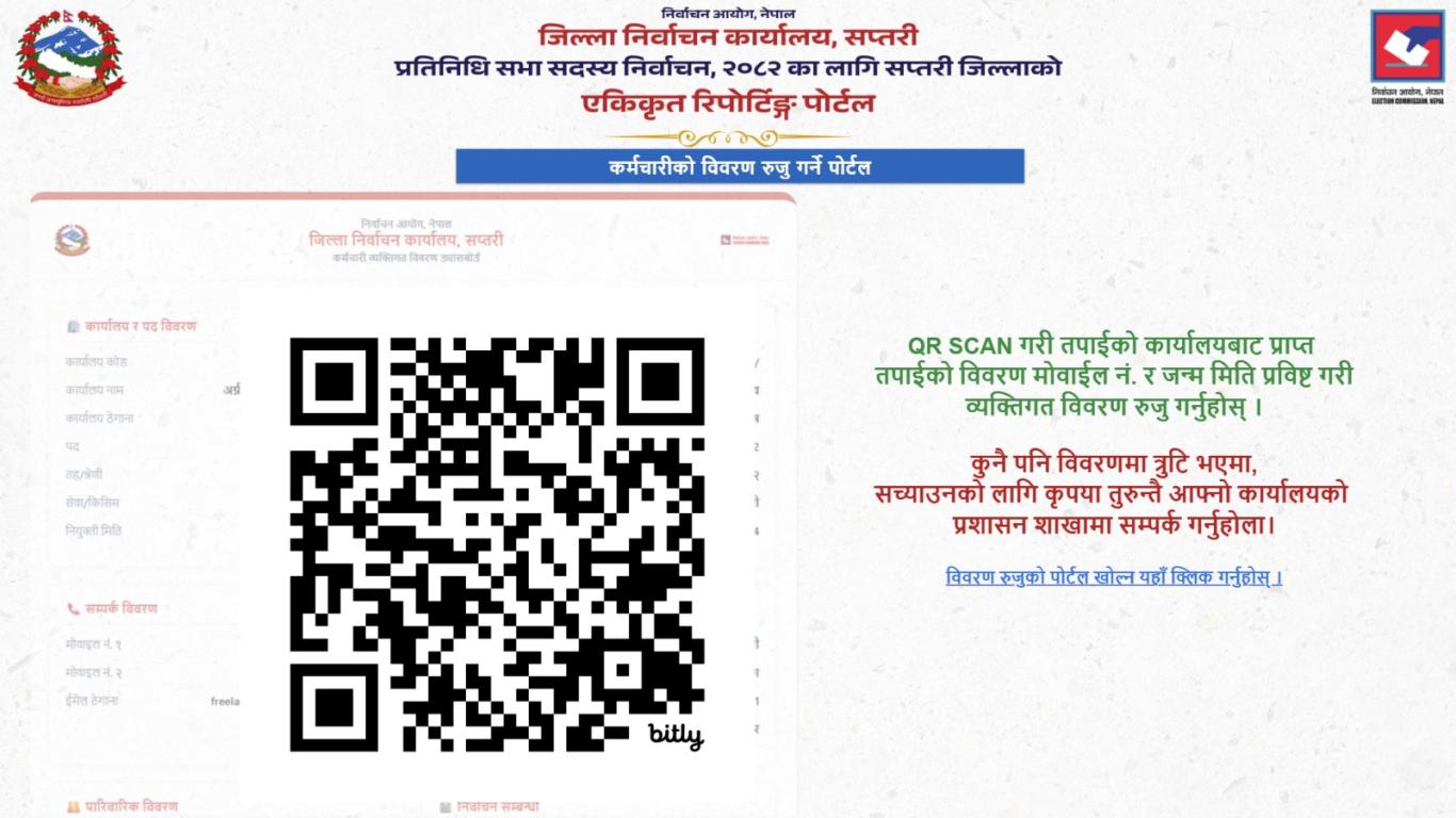 चुनावमा खटिने नामावली पठाइएका सम्पूर्ण कर्मचारीले QR Scan गरी आफ्नो विवरण चेक गर्नु हुन अनुरोध छ।